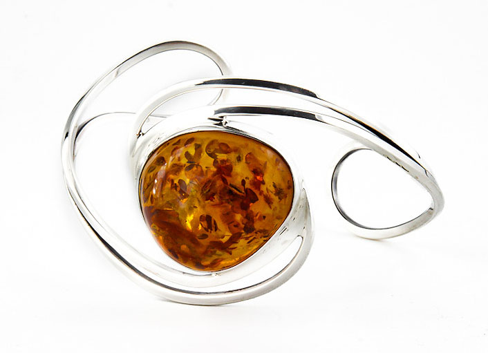 Strahlend schön kommt der cognacfarbene, geschliffene und polierte Bernstein in diesem Armreif zur Geltung. Die kleinen Luft-und Pyriteinschlüsse funkeln einzigartig im Licht. Die Form des Bernsteins wird einzigartig von der handgearbeiteten Fassung aus Sterlingsilber 925 aufgegriffen.