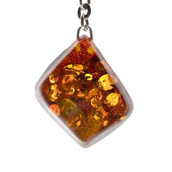 Dieser Schlüsselanhänger besteht aus einem rötlich schimmernden, geschliffenen Bernstein und Sterlingsilber 925. Der Bernstein enthält Luft- und Pyriteinschlüsse. Auf seiner Rückseite erkennt man Überreste der Verwitterungsschicht des Naturbernsteins. Der Schlüsselanhänger ist ein Unikat und wurde in Handarbeit gefertigt.
